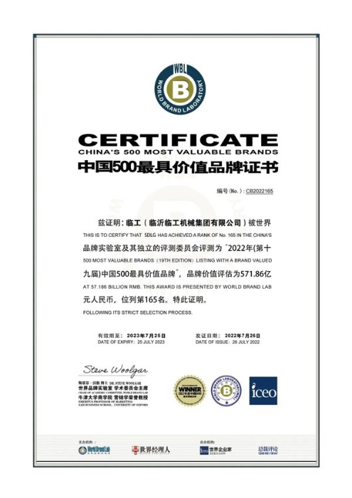 2022年7月26日,由世界品牌实验室主办的第十九届“世界品牌大会”在北京举行,会上发布了2022年《中国500最具价值品牌》排行榜,临工集团以571.86亿元品牌价值位列165位,连续9年登榜,品牌价值连年攀升。