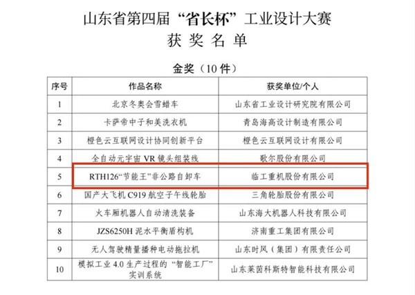 2022年8月29日,山东省委、省政府在济南召开先进制造业强省建设工作会议,并对先进制造业优质企业和创新产品颁奖授牌,临工重机RTH126非公路自卸车斩获山东省第四届“省长杯”工业设计大赛金奖,彰显临工重机科技创新动能。