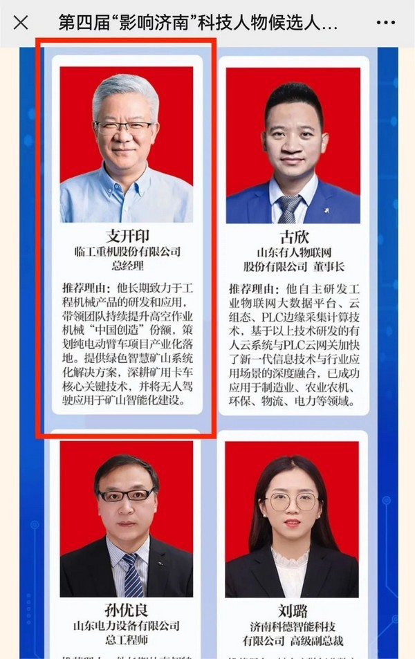 根据公示显示,支开印总经理入选的推荐理由为:长期致力于工程机械产品的研发和应用,带领团队持续提升高空作业机械“中国创造”份额,策划纯电动臂车项目产业化落地。提供绿色智慧矿山系统化解决方案,深耕矿用卡车核心关键技术,并将无人驾驶应用于矿山智能化建设。